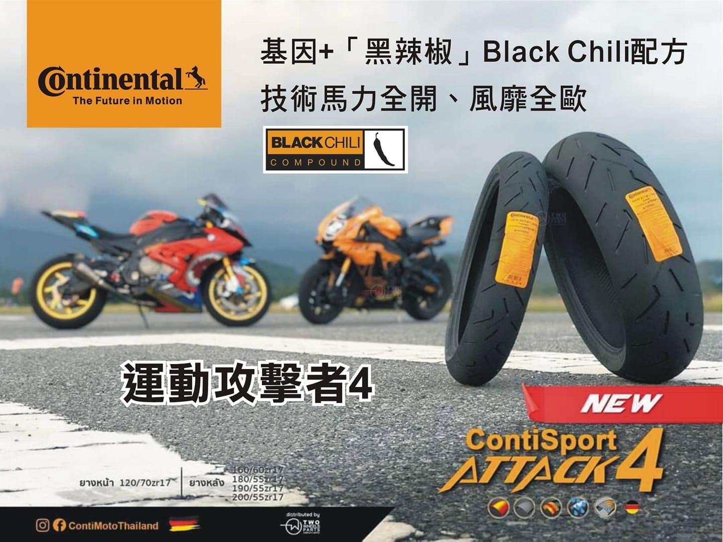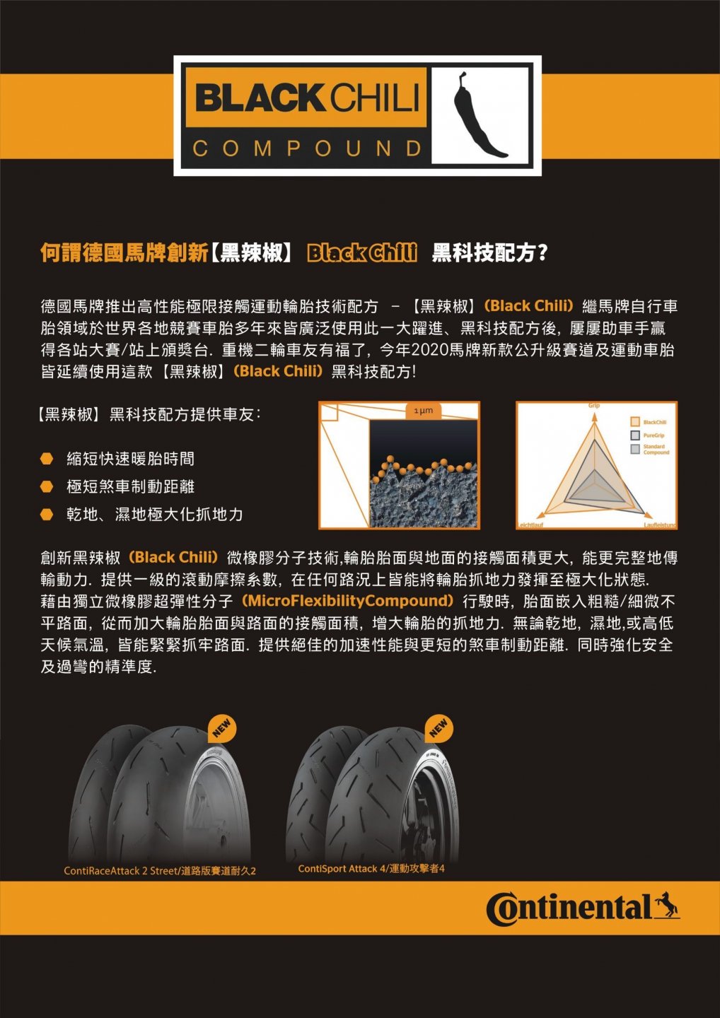 德國馬牌推出高性能極限接觸運動輪胎技術配方 – 黑辣椒(Black Chili) 繼馬牌自行車胎領域於世界各地競賽車胎多年來皆廣泛使用此一大躍進、黑科技配方後, 屢屢助車手贏得各站大賽/站上頒獎台. 重機二輪車友有福了, 今年2020馬牌新款公升級賽道及運動車胎皆延續使用這款【黑辣椒】Black Chili黑科技配方! 【黑辣椒】黑科技配方提供車友: • 縮短快速暖胎時間 • 極短煞車制動距離 • 乾地、濕地極大化抓地力 創新黑辣椒(Black Chili)微橡膠分子技術,輪胎胎面與地面的接觸面積更大, 能更完整地傳輸動力. 提供一級的滾動摩擦系數, 在任何路況上皆能將輪胎抓地力發揮至極大化狀態. 藉由獨立微橡膠超彈性分子(MicroFlexibilityCompound)行駛時, 胎面嵌入粗糙/細微不平路面, 從而加大輪胎胎面與路面的接觸面積, 增大輪胎的抓地力. 無論乾地, 濕地,或高低天候氣溫, 皆能緊緊抓牢路面. 提供絕佳的加速性能與更短的煞車制動距離. 同時強化安全及過彎的精準度. ......