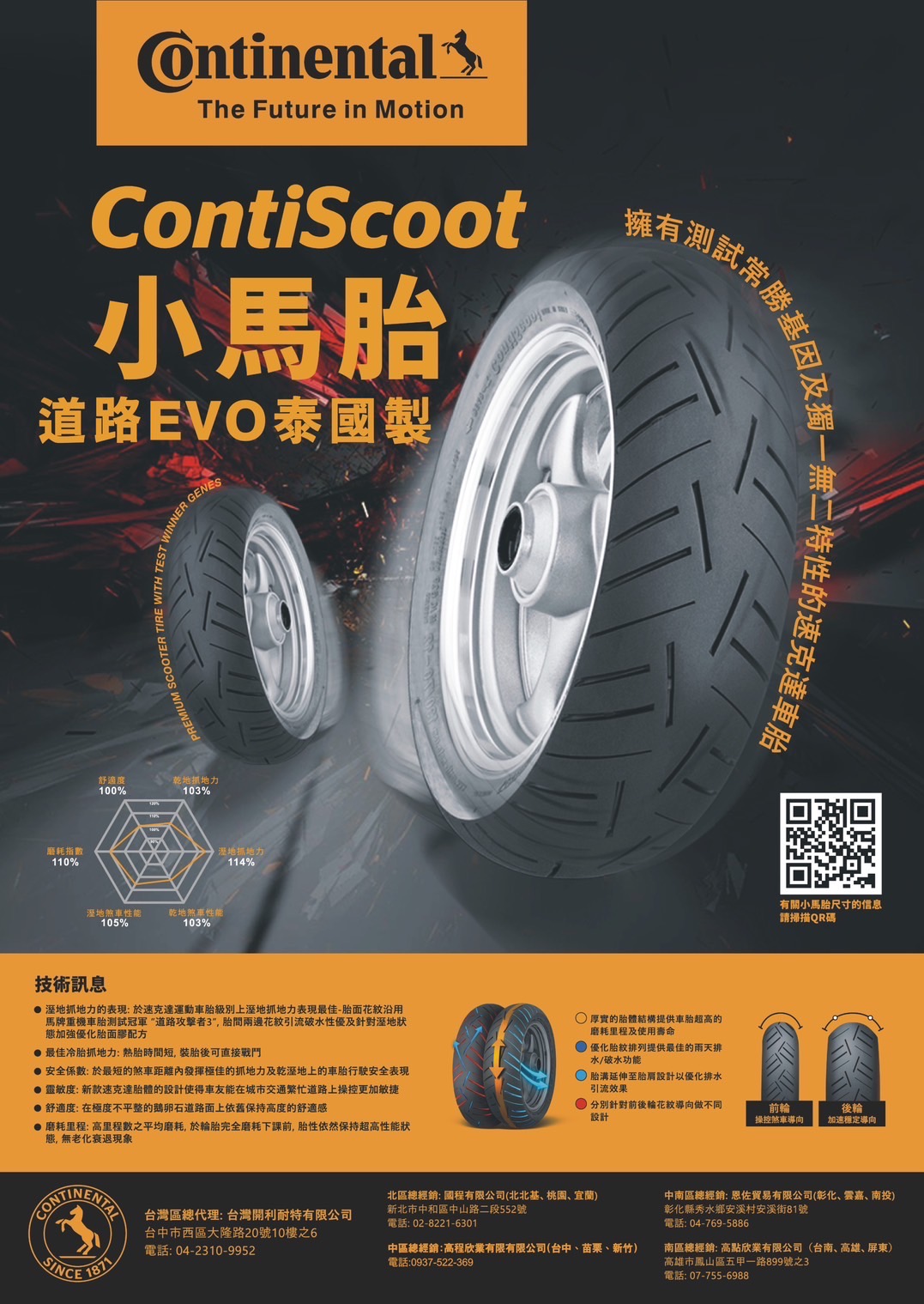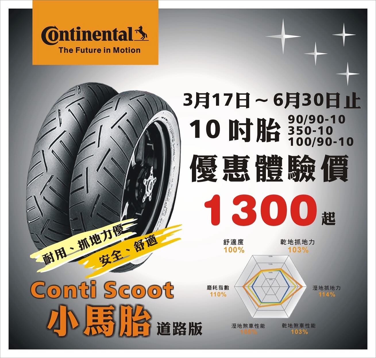 【#德國馬牌泰製小馬胎ContiScoot|超派˙超狂˙超Chill的車胎體驗價】 【 小馬胎10寸胎EVO 】全新道路通勤版!!! #強力上市囉 全台優惠安裝體驗價$1300/條起 活動期間114年3月17日~114年6月30日 聯繫馬牌小編預約台南/高雄/屏東配合店家安裝、上馬牌官網查詢附近配合店家 (德國馬牌官網www.conti-moto.tw) 進口品牌10寸胎這體驗價應該不用考慮國產胎了吧!!! 給自己及家人一次機會來體驗馬牌輪胎的魅力及全方位的安全保護!!! ── ✦── ✦ ──✦ ── ✦ ── 小馬胎10寸胎EVO // 3種規格含括125cc以下機車車種 ⟣ 3.50-10 RF加強版 ⟣ 100/90-10 ⟣ 90/90-10 (預計5-6月份進倉、可先預約) ── ✦── ✦ ──✦ ── ✦ ── ♦︎ 德國馬牌唯一亞洲泰國新摩托車輪胎生產基地 ♦︎ 德國原廠SOP輪胎生產、自家生產品質穩定 ♦︎ 高磨耗里程胎性兼具晴雨天抓地安全 ♦︎ 過彎傾角反應靈敏及操控性穩定、提供車友最大安全性保護 #小馬胎 #ContiScoot道路通勤用胎 #Continentalmoto #www.conti-moto.tw #馬牌摩托車輪胎 ......